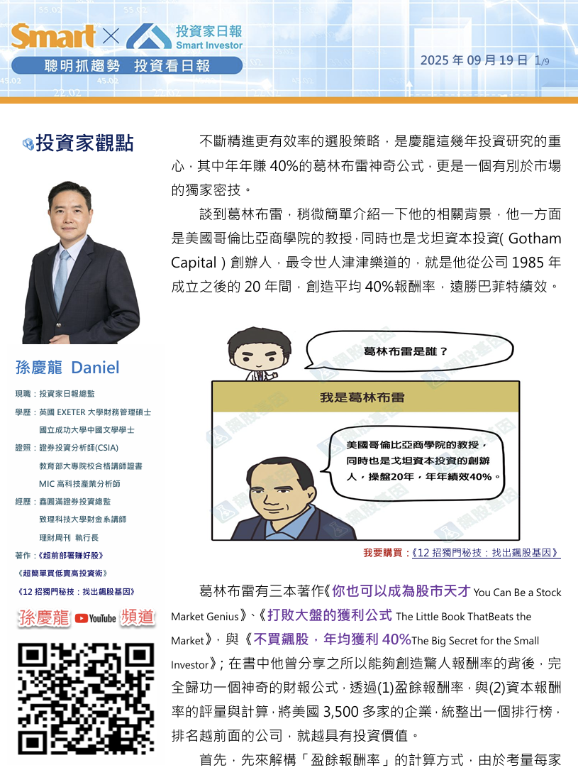 不斷精進更有效率的選股策略,是慶龍這幾年投資研究的重心,其中年年賺40%的葛林布雷神奇公式,更是一個有別於市場的獨家密技。
