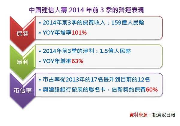 4年前王銘陽的宣示,4年後再來檢視,被賦予厚望的建信人壽,終於在2014年出現較明顯的營運增長,前3季的保費收入達到159億人民幣,較2013年同期成長101%的同時,一方面帶動淨利年增63%來到1.5億人民幣,另一方面市佔率也從第17名提升到第12名。此外,值得注意的變化,就是2014年Q3所新增的契約中,有高達60%的比重是來自於建設銀行所發行的聯名卡(信用卡),顯示銀行端與建信人壽已經建構出魚幫水水幫魚的行銷平台,預估將有利於未來保單的推廣。