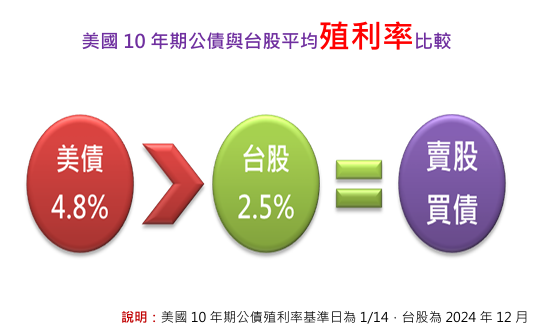 舉例來說,在完全不考慮未來「成長性」的條件下,目前投資台股的平均殖利率落在2.5%(編按:2024年12月),投資美國10年期公債的殖利率則落在4.8%。