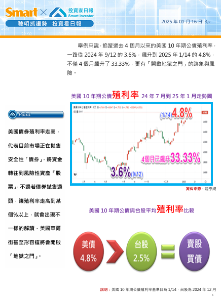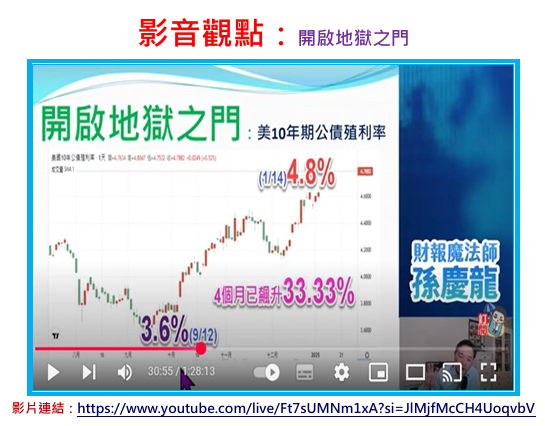 舉例來說,追蹤過去4個月以來的美國10年期公債殖利率,一路從2024年9/12的3.6%,飆升到2025年1/14的4.8%,不僅4個月飆升了33.33%,更有「開啟地獄之門」的跡象與風險。