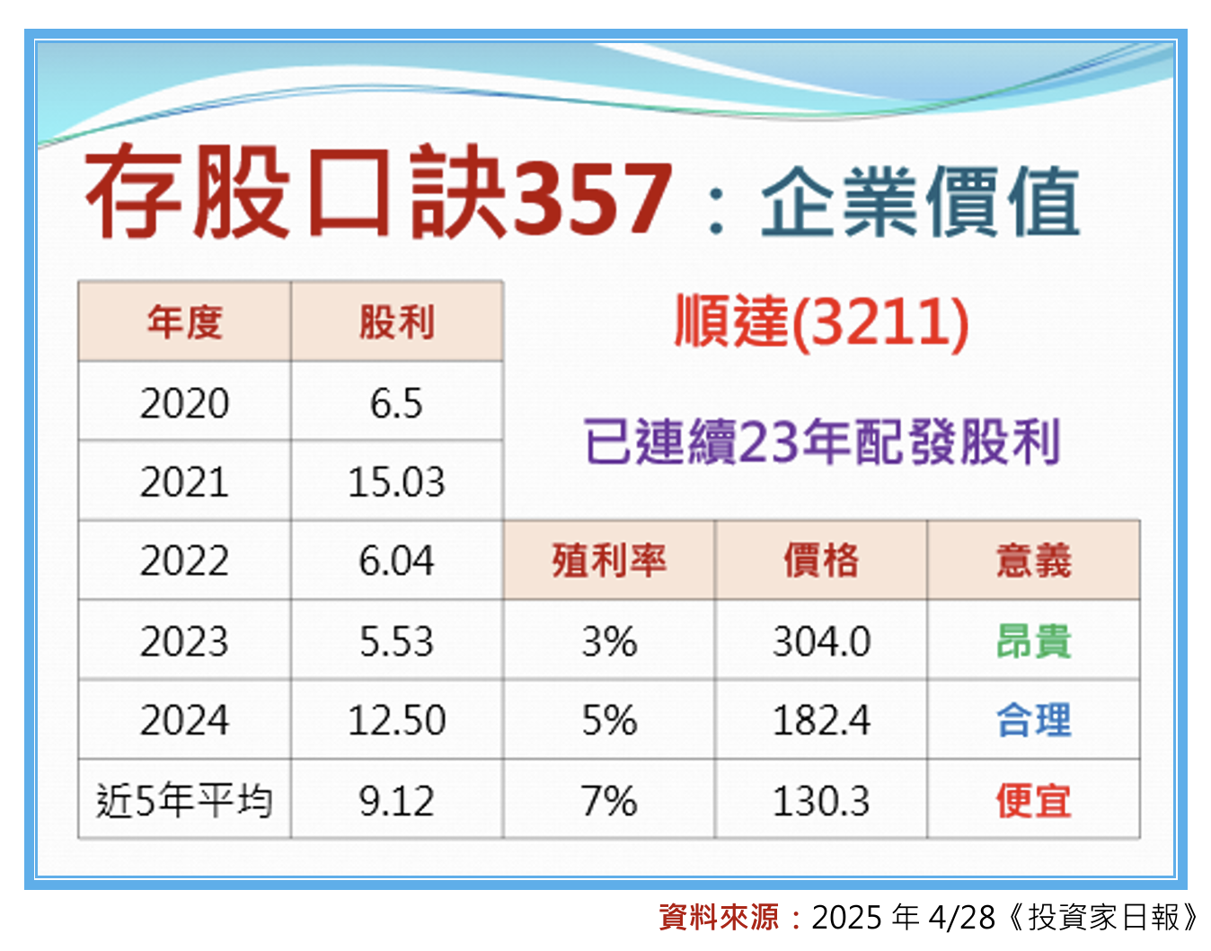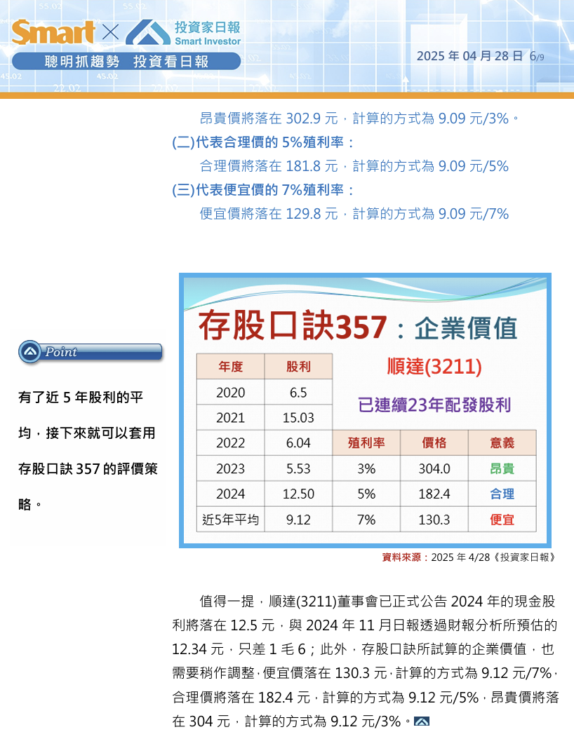 值得一提,順達(3211)董事會已正式公告2024年的現金股利將落在12.5元,與2024年11月日報透過財報分析所預估的12.34元,只差1毛6;此外,存股口訣所試算的企業價值,也需要稍作調整,便宜價落在130.3元,計算的方式為9.12元/7%,合理價將落在182.4元,計算的方式為9.12元/5%,昂貴價將落在304元,計算的方式為9.12元/3%。![]()