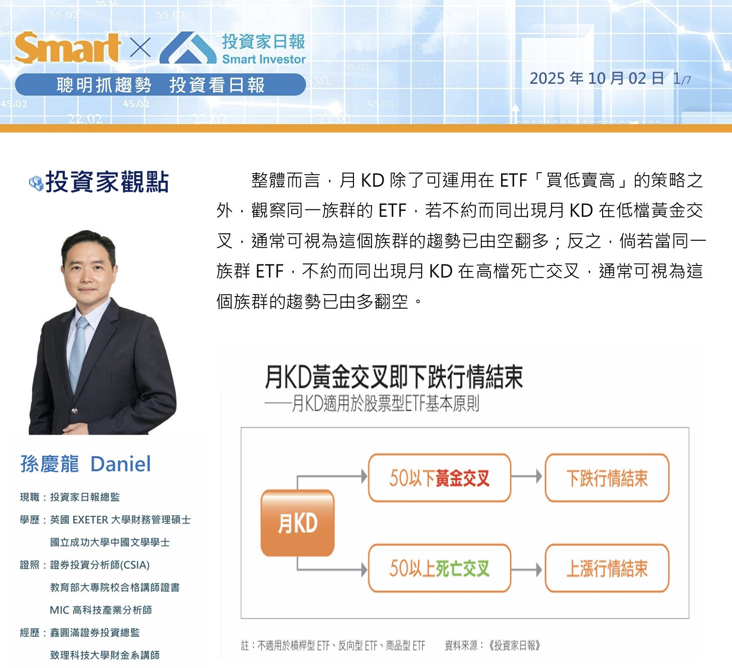 整體而言,月KD除了可運用在ETF「買低賣高」的策略之外,觀察同一族群的ETF,若不約而同出現月KD在低檔黃金交叉,通常可視為這個族群的趨勢已由空翻多;反之,倘若當同一族群ETF,不約而同出現月KD在高檔死亡交叉,通常可視為這個族群的趨勢已由多翻空。