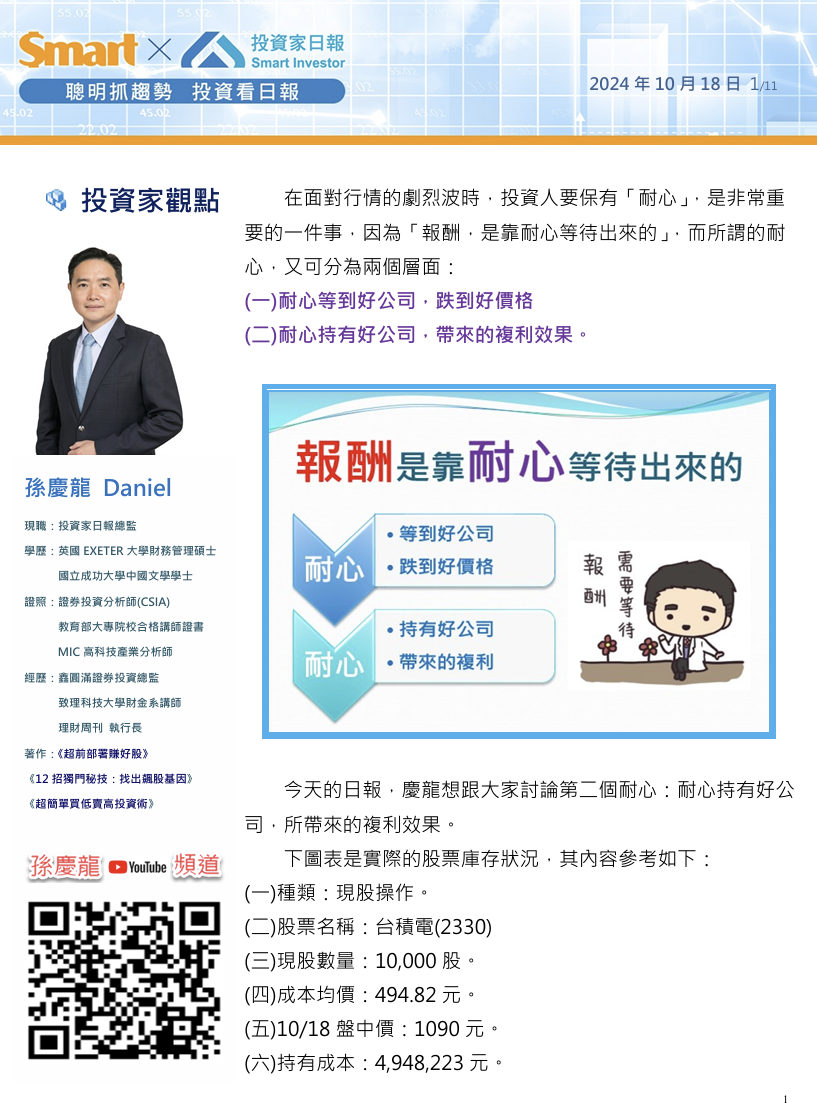今天的日報,慶龍想跟大家討論第二個耐心:耐心持有好公司,所帶來的複利效果。