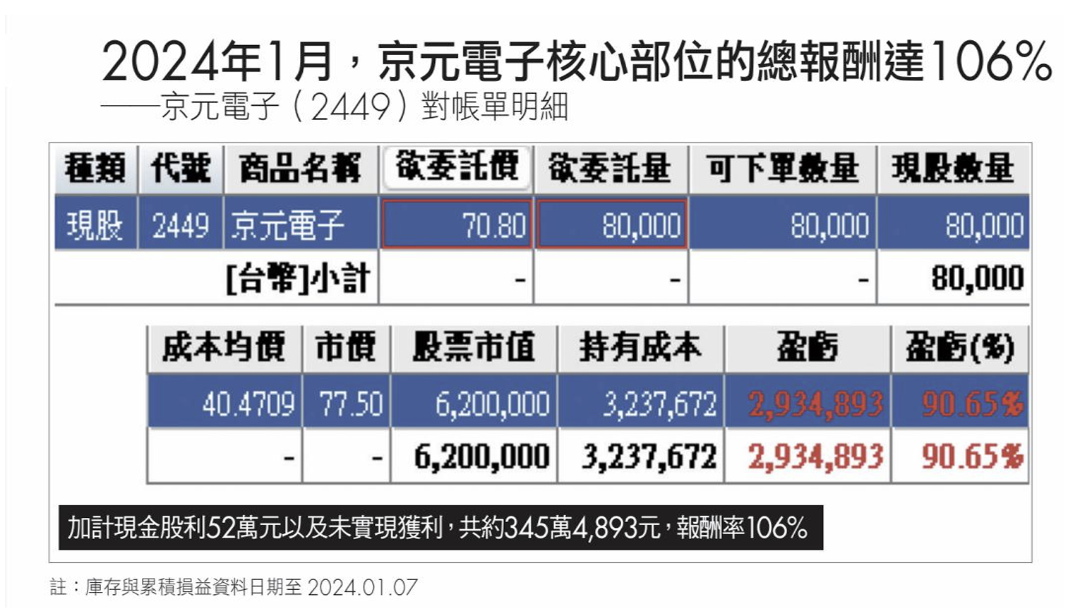 下圖是2024年1月17日實際的京元電子股票核心庫存,詳細內容如下: