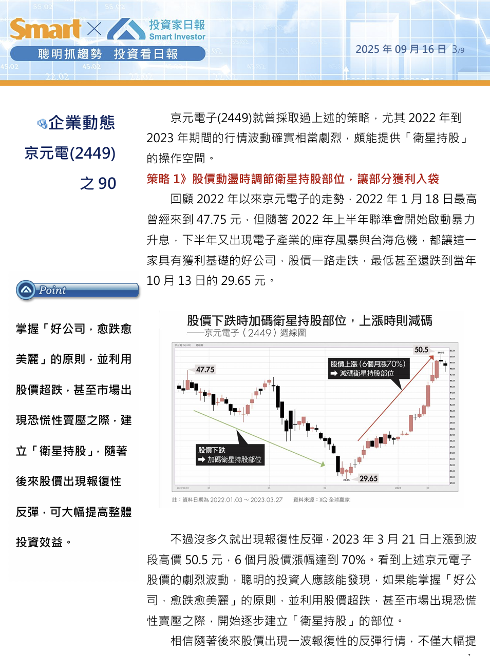 不過沒多久就出現報復性反彈,2023年3月21日上漲到波段高價50.5元,6個月股價漲幅達到70%。看到上述京元電子股價的劇烈波動,聰明的投資人應該能發現,如果能掌握「好公司,愈跌愈美麗」的原則,並利用股價超跌,甚至市場出現恐慌性賣壓之際,開始逐步建立「衛星持股」的部位。