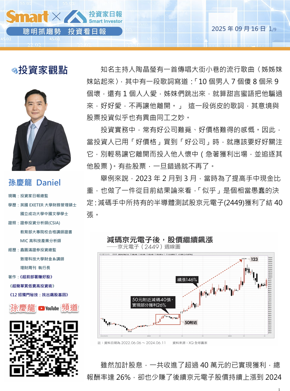 投資實務中,常有好公司難覓、好價格難得的感慨。因此,當投資人已用「好價格」買到「好公司」時,就應該要好好關注它,別輕易讓它離開而投入他人懷中(急著獲利出場,並追逐其他股票)。有些股票,一旦錯過就不再了。