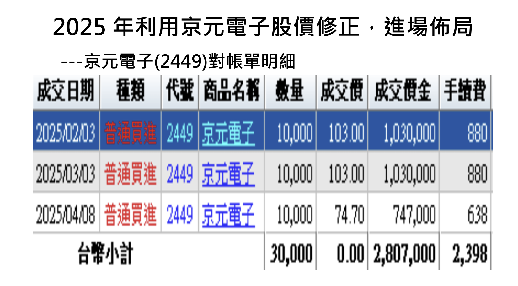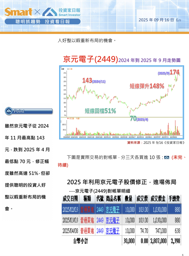 相同的狀況,2025年再度上演一次,隨著京元電子股價一路從2024年11月最高點143元,跌到2025年4月最低點70元,修正幅度雖然高達51%,但行情的劇烈波動,反而提供投資人好整以暇重新布局的機會。