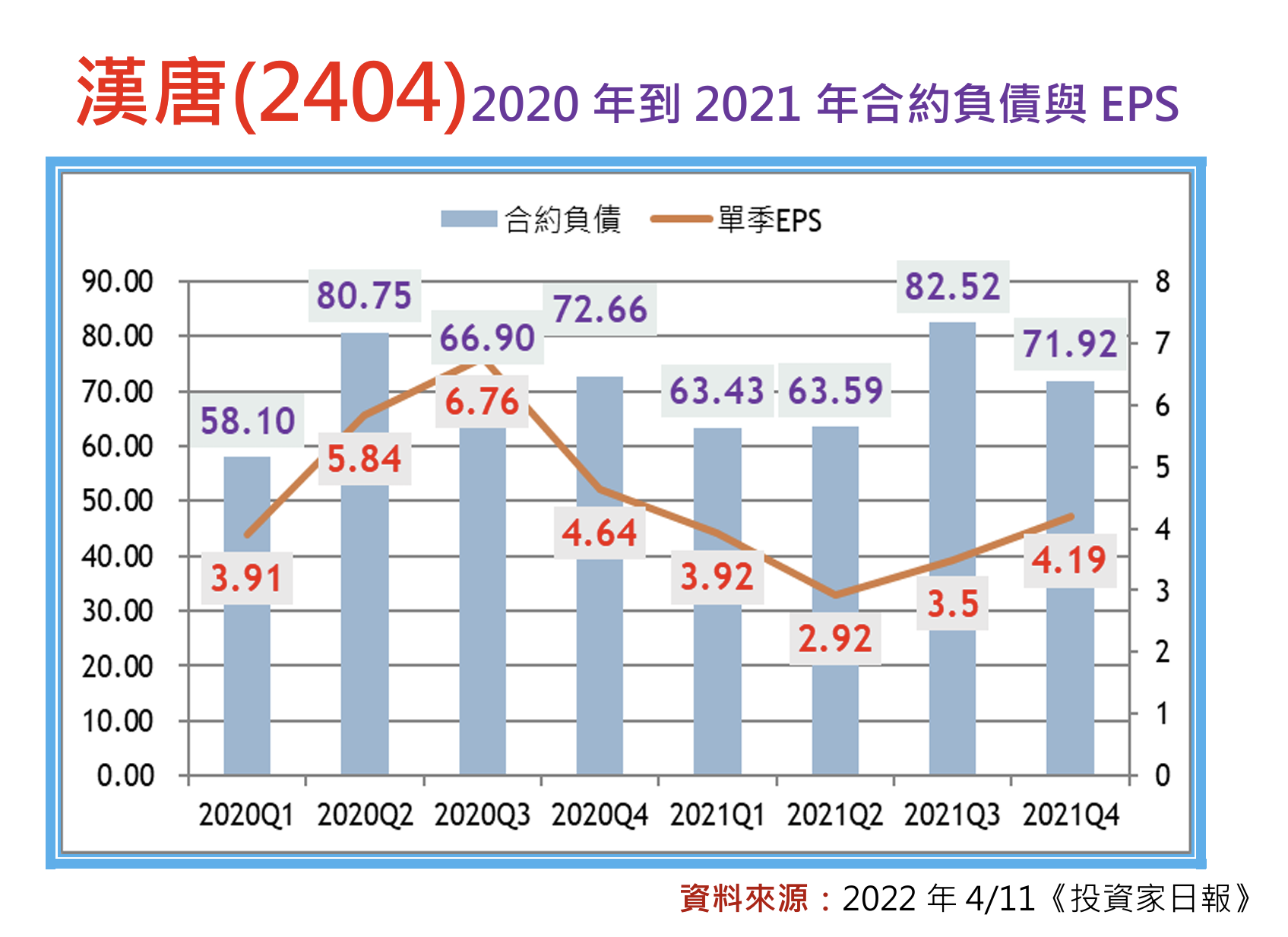 漢唐(2404)除了技術分析指標出現了中長期趨勢有機會「由空翻多」的轉折變化之外,財報分析的領先指標-合約負債,也看到走升的變化,繼2021年Q3合約負債飆高到創歷史新高的82.52億元之後,2021年Q4合約負債也達到71.92億元的水準,頗有走出2021年上半年營運谷底的跡象,當時Q1與Q2的合約負債為63.43億元與63.59億元。