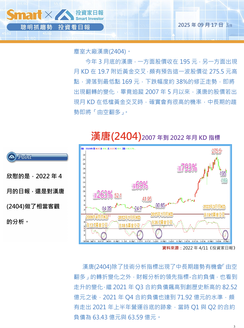 今年3月底的漢唐,一方面股價收在195元,另一方面出現月KD在19.7附近黃金交叉,頗有預告這一波股價從275.5元高點,滑落到最低點169元,下跌幅度約38%的修正走勢,即將出現翻轉的變化,畢竟追蹤2007年5月以來,漢唐的股價若出現月KD在低檔黃金交叉時,確實會有很高的機率,中長期的趨勢即將「由空翻多」。