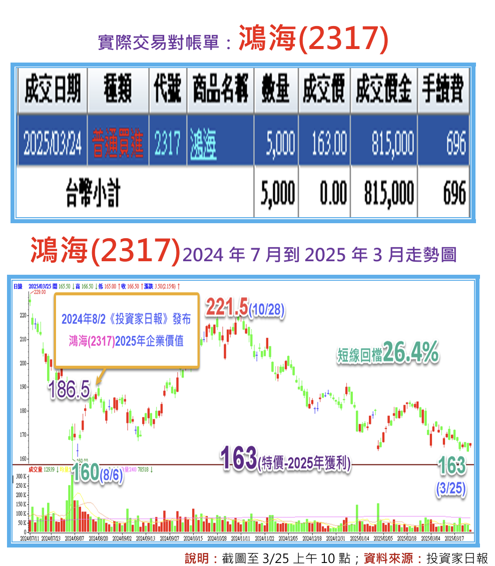 不過,也由於有目前市場偏空的投資氛圍,才讓日報長期追蹤的鴻海(2317),近期的股價,跌到以2025年獲利為基準的特價163元;下圖表是實際股票的交易對帳單,其內容參考如下: