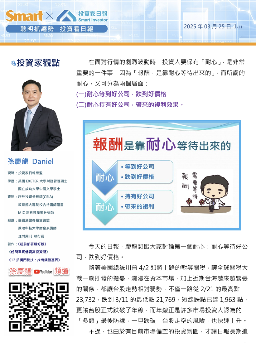 今天的日報,慶龍想跟大家討論第一個耐心:耐心等待好公司,跌到好價格。
