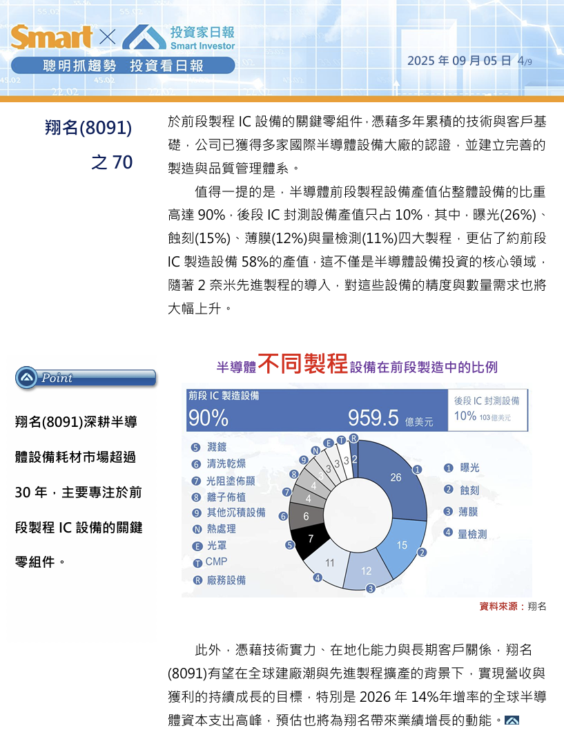 此外,憑藉技術實力、在地化能力與長期客戶關係,翔名(8091)有望在全球建廠潮與先進製程擴產的背景下,實現營收與獲利的持續成長的目標,特別是2026年14%年增率的全球半導體資本支出高峰,預估也將為翔名帶來業績增長的動能。