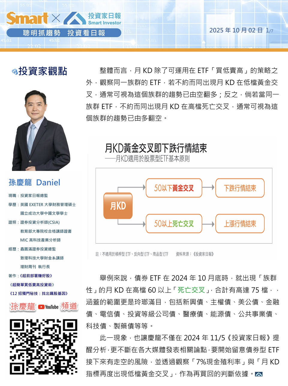 此一現象,也讓慶龍不僅在2024年11/5《投資家日報》提醒分析,更不斷在各大媒體發表相關論點,要開始留意債券型ETF接下來有走空的風險,並透過觀察「7%現金殖利率」與「月KD指標再度出現低檔黃金交叉」,作為再買回的判斷依據。