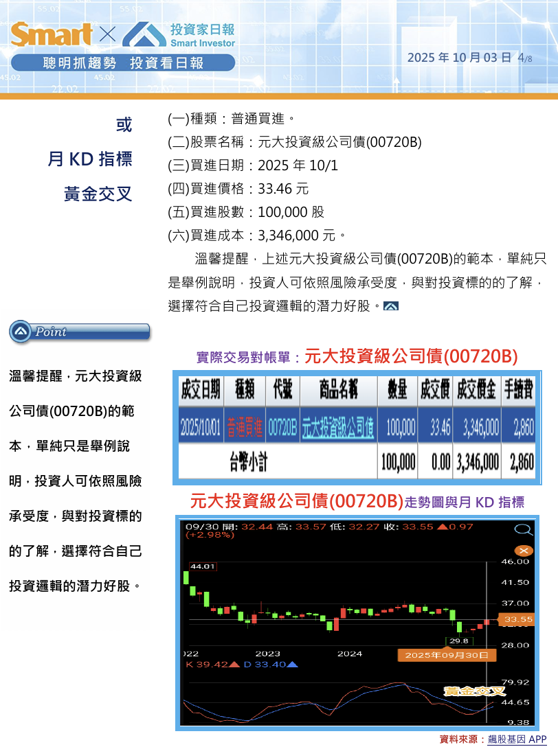 關於時機2月KD指標出現低檔黃金交叉,以元大投資級公司債(00720B)為例,今年9月底的月K值為39.42,不僅高過月D值的33.4,由於8月底的月K值也小於月D值,因此符合月KD指標在低檔出現黃金交叉的條件。
