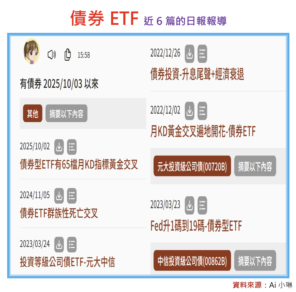 此外,新訂戶若要回看更多債券ETF的分析,可在日報專屬Line群私訊小編索取,目前新訂戶免費回看上限為5份,若想多看,可洽詢加購Ai小琳的優惠方案。