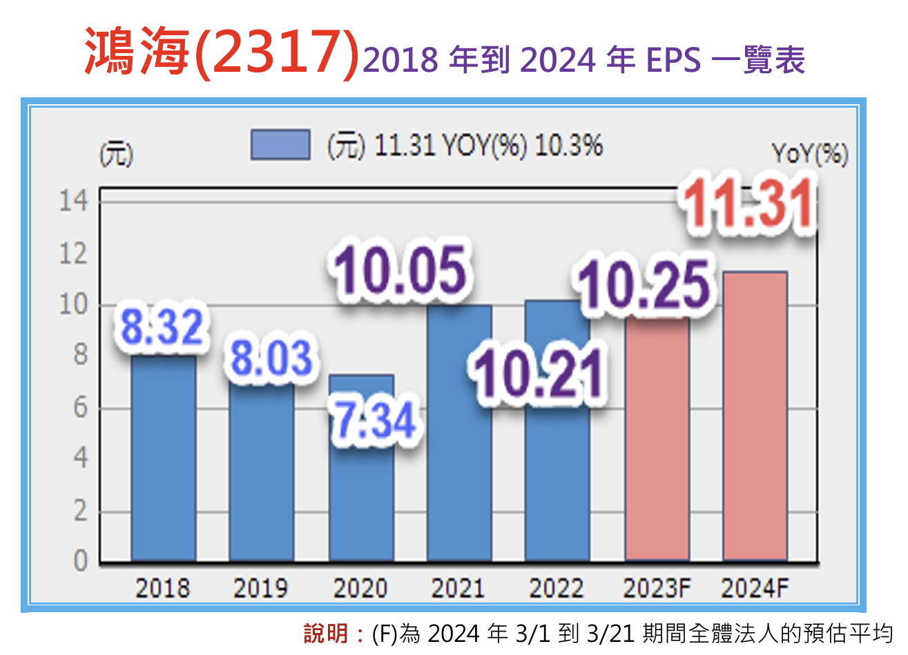 截至目前為止,全體法人對於鴻海2024年的EPS預估,平均值落在11.31元,不僅較2023年10.25元的EPS成長1.06元,年增10.34%,更有要突破過去三年始終在10元附近的獲利天花板。