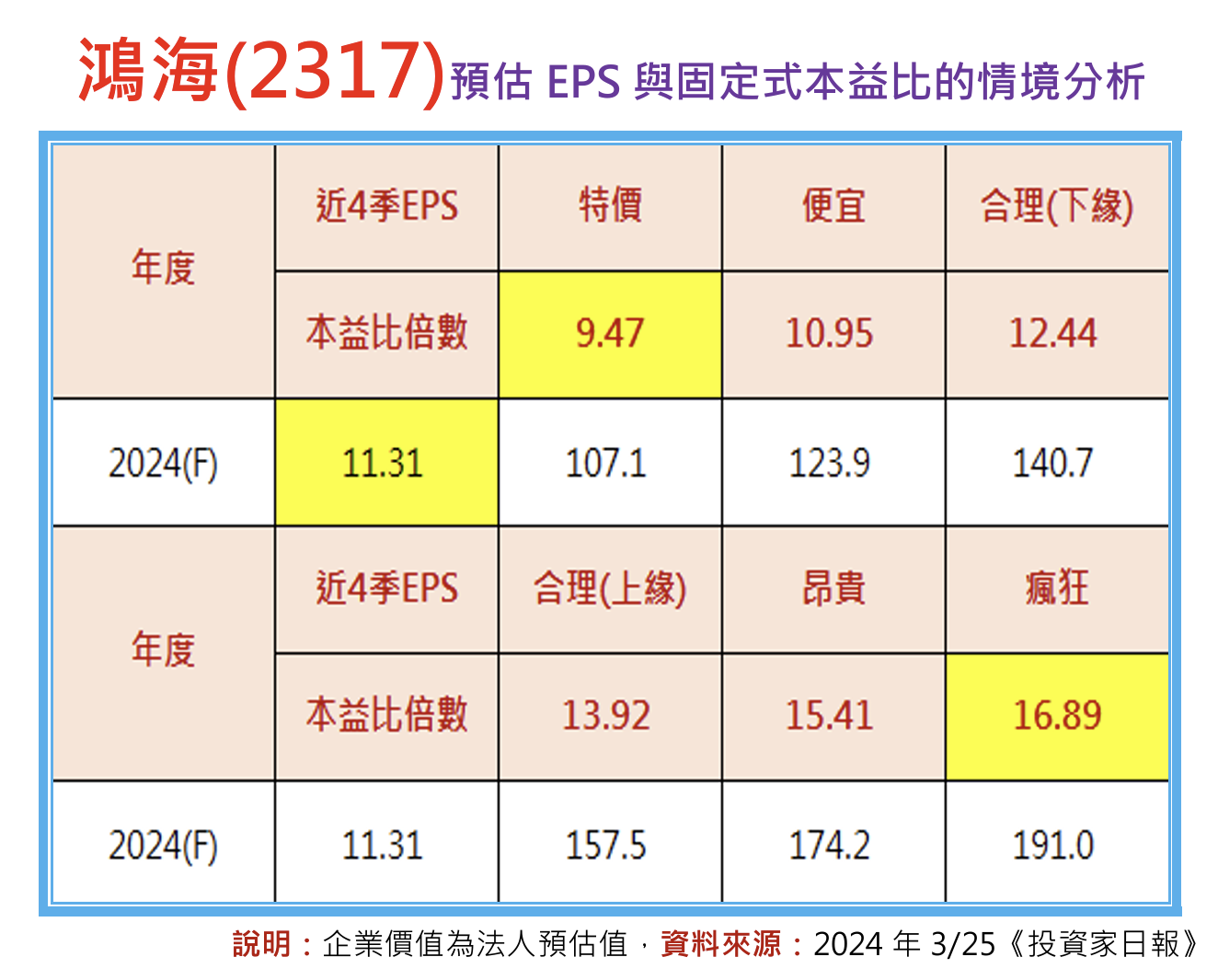 有了2024年法人預估的鴻海(2317)EPS為11.31元之後,接下來就可以透過市場願意給予的本益比倍數,推算出企業價值的目標。