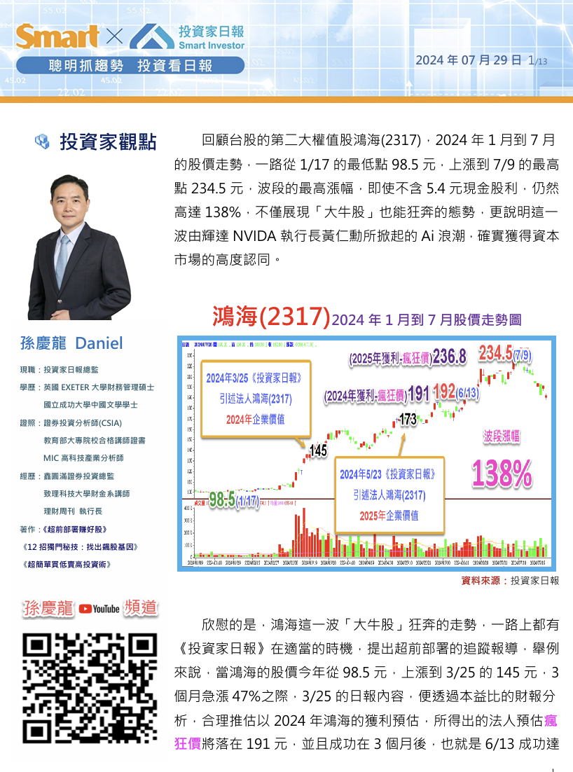 欣慰的是,鴻海這一波「大牛股」狂奔的走勢,一路上都有《投資家日報》在適當的時機,提出超前部署的追蹤報導,舉例來說,當鴻海的股價今年從98.5元,上漲到3/25的145元,3個月急漲47%之際,3/25的日報內容,便透過本益比的財報分析,合理推估以2024年鴻海的獲利預估,所得出的法人預估瘋狂價將落在191元,並且成功在3個月後,也就是6/13成功達陣,當天鴻海股價收盤為192元。