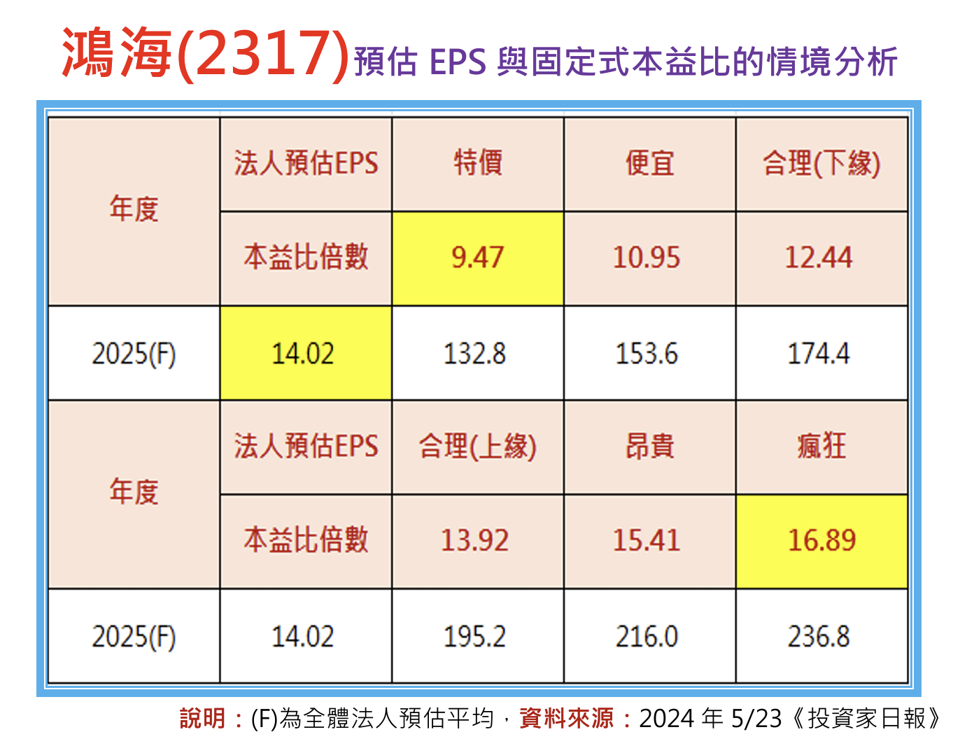 有了2025年法人預估的鴻海(2317)EPS為14.02元之後,接下來就可以透過市場願意給予的本益比倍數,推算出企業價值的目標。