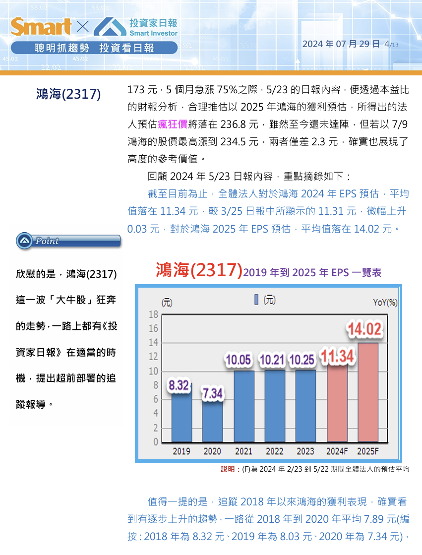舉例來說,當鴻海的股價今年從98.5元,上漲到5/23的173元,5個月急漲75%之際,5/23的日報內容,便透過本益比的財報分析,合理推估以2025年鴻海的獲利預估,所得出的法人預估瘋狂價將落在236.8元,雖然至今還未達陣,但若以7/9鴻海的股價最高漲到234.5元,兩者僅差2.3元,確實也展現了高度的參考價值。