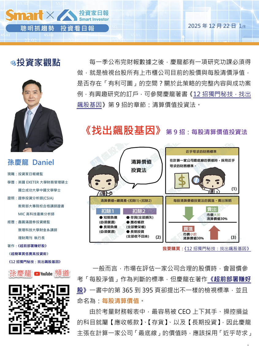 每一季公布完財報數據之後,慶龍都有一項研究功課必須得做,就是檢視台股所有上市櫃公司目前的股價與每股清價淨值,是否存在「有利可圖」的空間?關於此策略的完整內容與成功案例,有興趣研究的訂戶,可參閱慶龍著書《12招獨門秘技,找出飆股基因》第9招的章節:清算價值投資法。