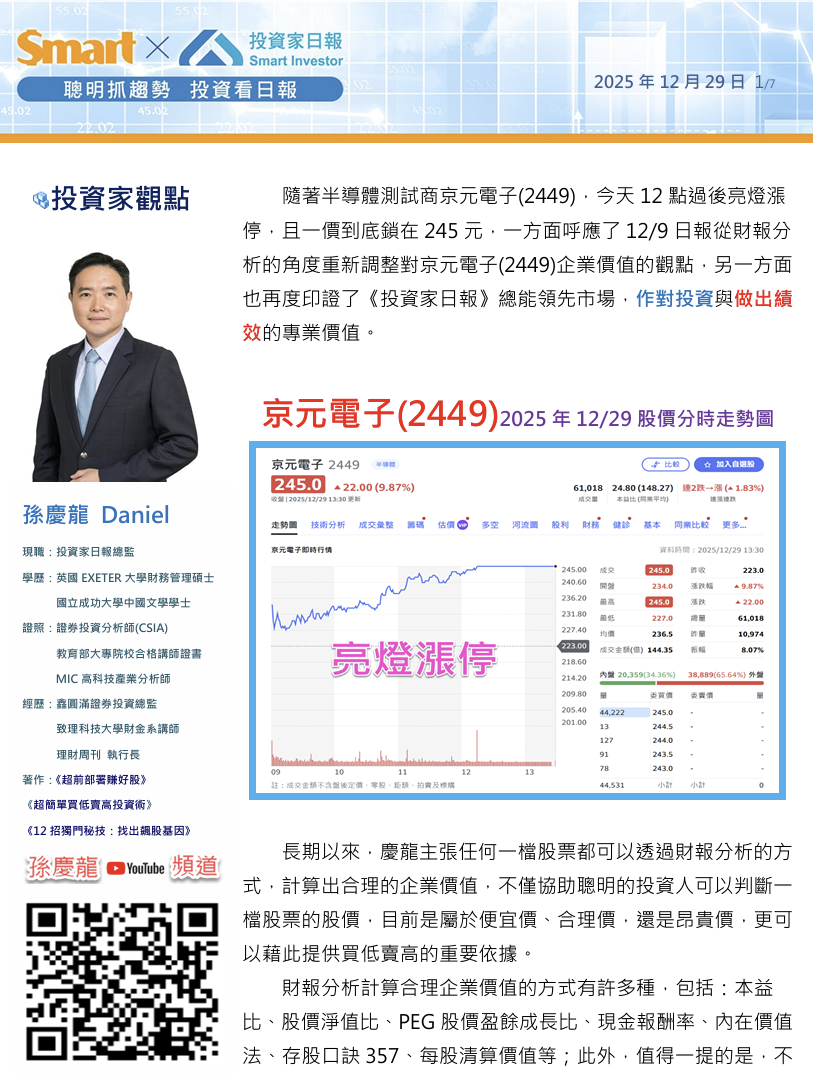 隨著半導體測試商京元電子(2449),今天12點過後亮燈漲停,且一價到底鎖在245元,一方面呼應了12/9日報從財報分析的角度重新調整對京元電子(2449)企業價值的觀點,另一方面也再度印證了《投資家日報》總能領先市場,作對投資與做出績效的專業價值。