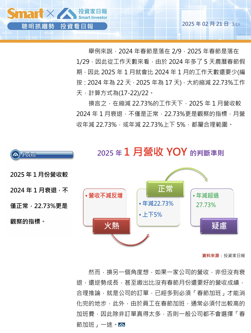 換言之,在縮減22.73%的工作天下,2025年1月營收較2024年1月衰退,不僅是正常,22.73%更是觀察的指標,月營收年減22.73%,或年減22.73%上下5%,都屬合理範圍。