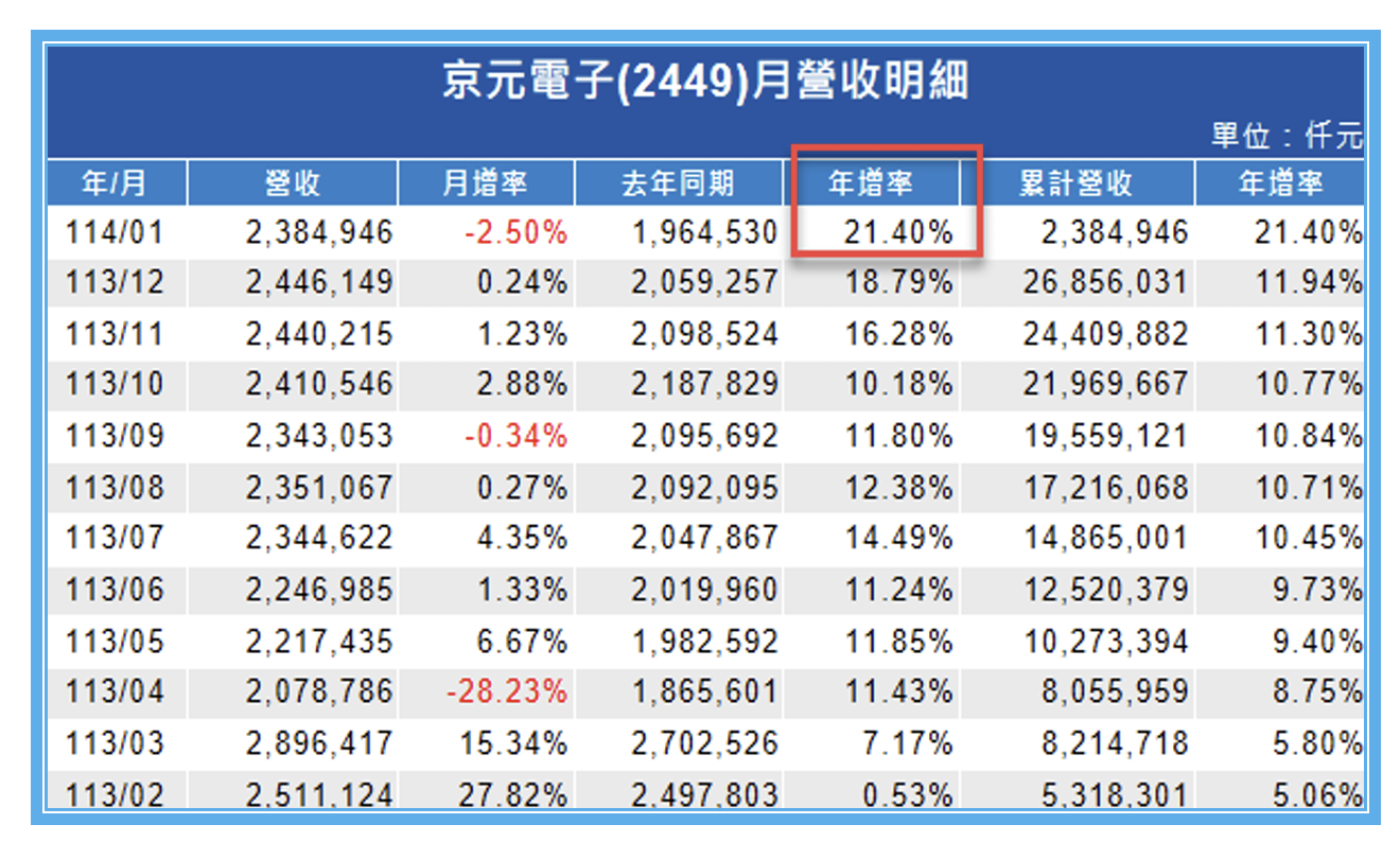 了解了上述財報分析的邏輯之後,相信就會對於半導體測試廠商京元電子(2449)所公布的1月營收感到樂觀的期待,因為在1月份工作天數較去年減少22.73%的條件下,1月營收非但沒有衰退,甚至還逆勢繳出23.84億元,較去年同期的19.64億元,年增21.4%的成績單。