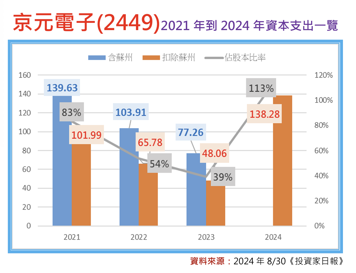 扣除蘇州子公司,2021年資本支出從139.63億元,下降至101.99億元,佔股本比率為83%,2022年資本支出從103.91億元,下降至65.78億元,佔股本比率為54%,2023年資本支出從77.26億元,下降至48.06億元,佔股本比率為39%,2024年資本支出則是來到138.28億元,並創下不含蘇州子公司後的歷史新高。