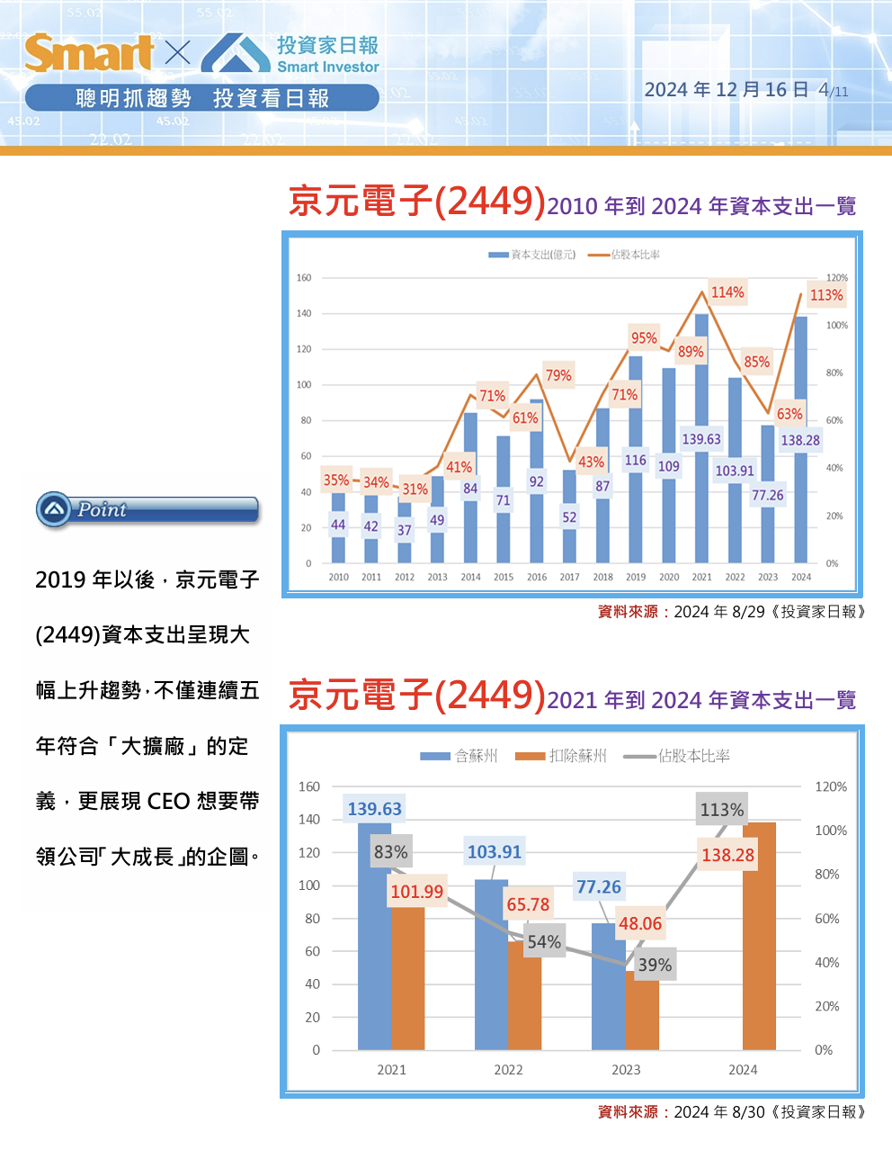 在經歷2019年到2022年這四年爆發期之後,2023年京元電子(2449)的資本支出雖然出現下滑,但隨著AI測試訂單持續湧入,2024年的資本支出再度跳升,董事會在2024年8/8決議,今年的資本支出,將由年初時預定的87.79億元,提高至138.28億元,增幅高達57.5%,確實展現CEO想要帶領公司「大成長」的企圖。