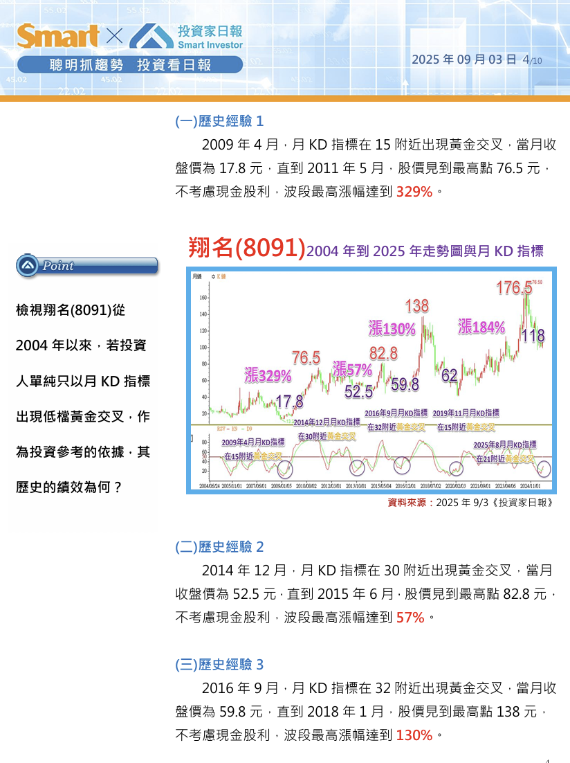 檢視2025年8月底出現月KD指標在25以下黃金交叉的口袋名單,核心業務在半導體設備的翔名(8091)是第一檔引起慶龍研究的標的,從2004年以來,若投資人單純只以月KD指標出現低檔黃金交叉,作為投資參考的依據,其歷史的績效為何?