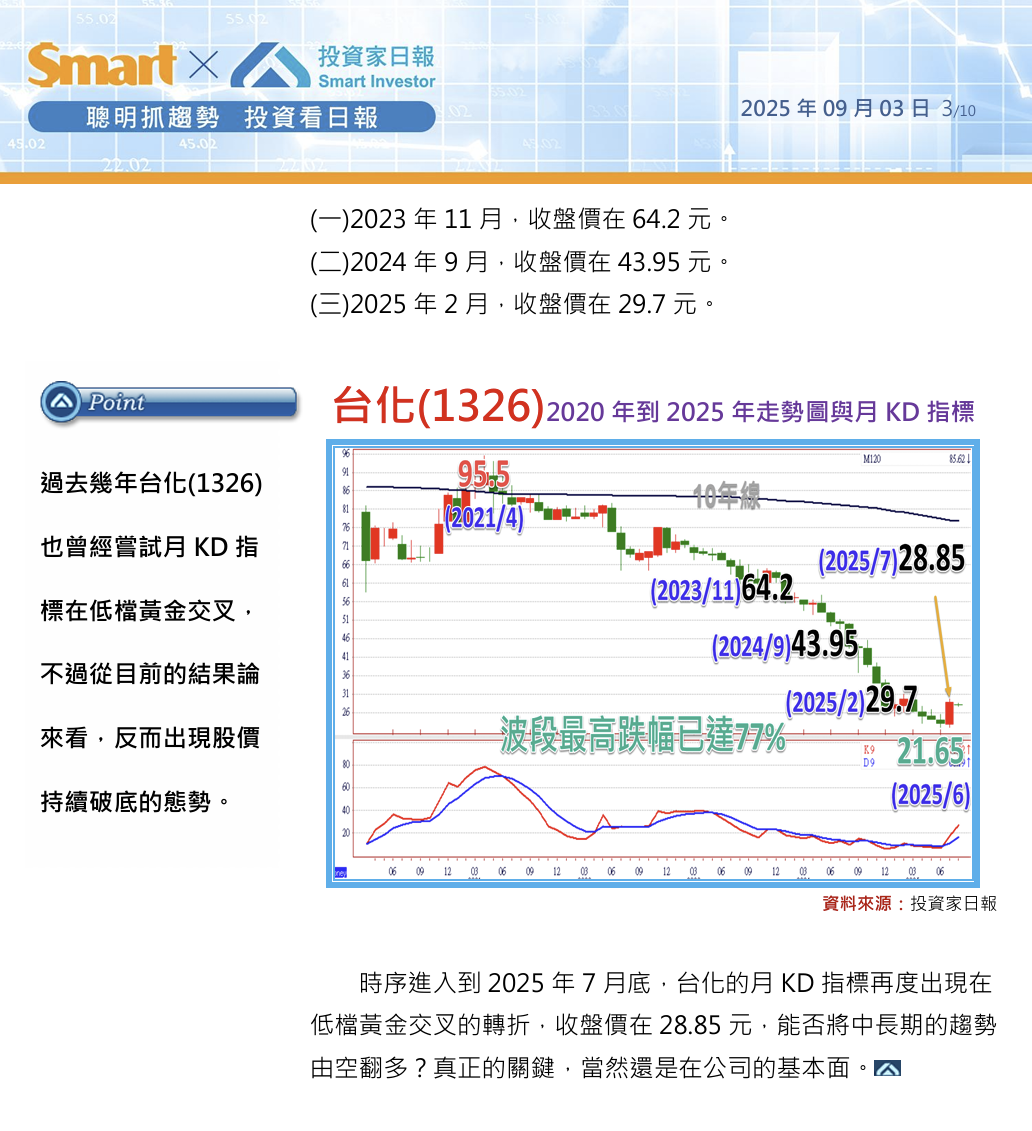 時序進入到2025年7月底,台化的月KD指標再度出現在低檔黃金交叉的轉折,收盤價在28.85元,能否將中長期的趨勢由空翻多?真正的關鍵,當然還是在公司的基本面。