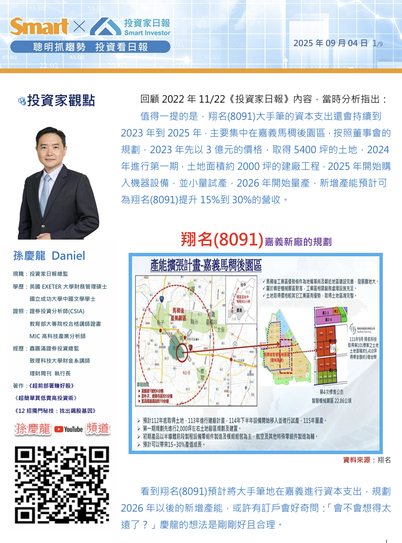 看到翔名(8091)預計將大手筆地在嘉義進行資本支出,規劃2026年以後的新增產能,或許有訂戶會好奇問:「會不會想得太遠了?」慶龍的想法是剛剛好且合理。