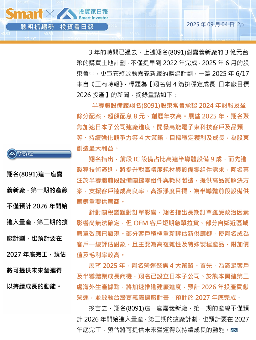 3年的時間已過去,上述翔名(8091)對嘉義新廠的3億元台幣的購買土地計劃,不僅提早到2022年完成,2025年6月的股東會中,更宣布將啟動嘉義新廠的擴建計劃,一篇2025年6/17來自《工商時報》,標題為【翔名射4箭拚穩定成長 日本廠目標2026投產】的新聞,摘錄重點如下: