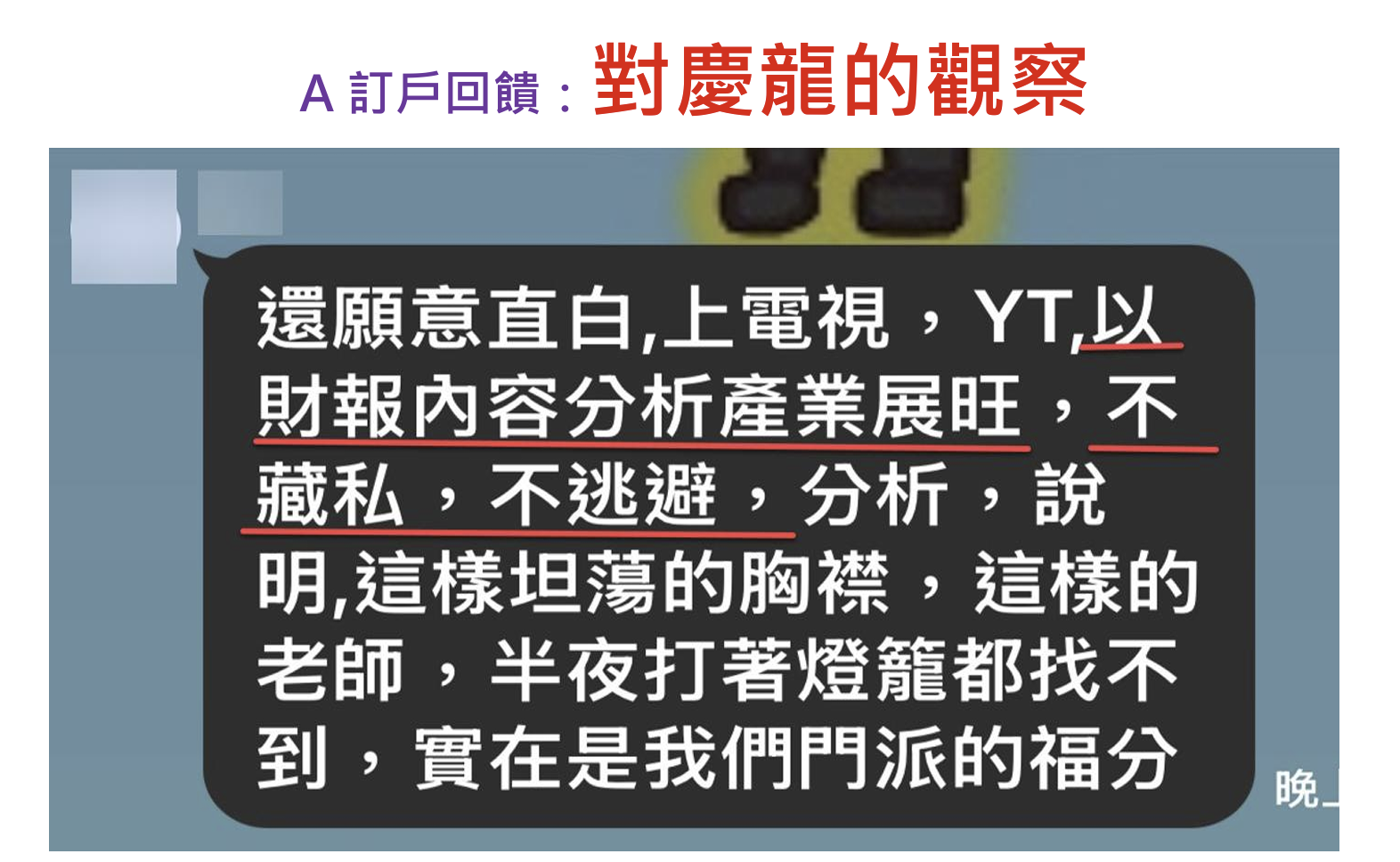 最後以一位訂戶的留言觀察做結論,作為資訊提供者,慶龍能做的,就是秉持專業、抱持不藏私、不逃避、坦蕩的原則,做好協助訂戶攻上財富聖母峰旁「雪巴人」的角色,慶龍的工作不是代替你爬山,畢竟山,還是得自己爬,而是希望能透過一些多年來累積的經驗,幫助大家少走一些冤枉路。