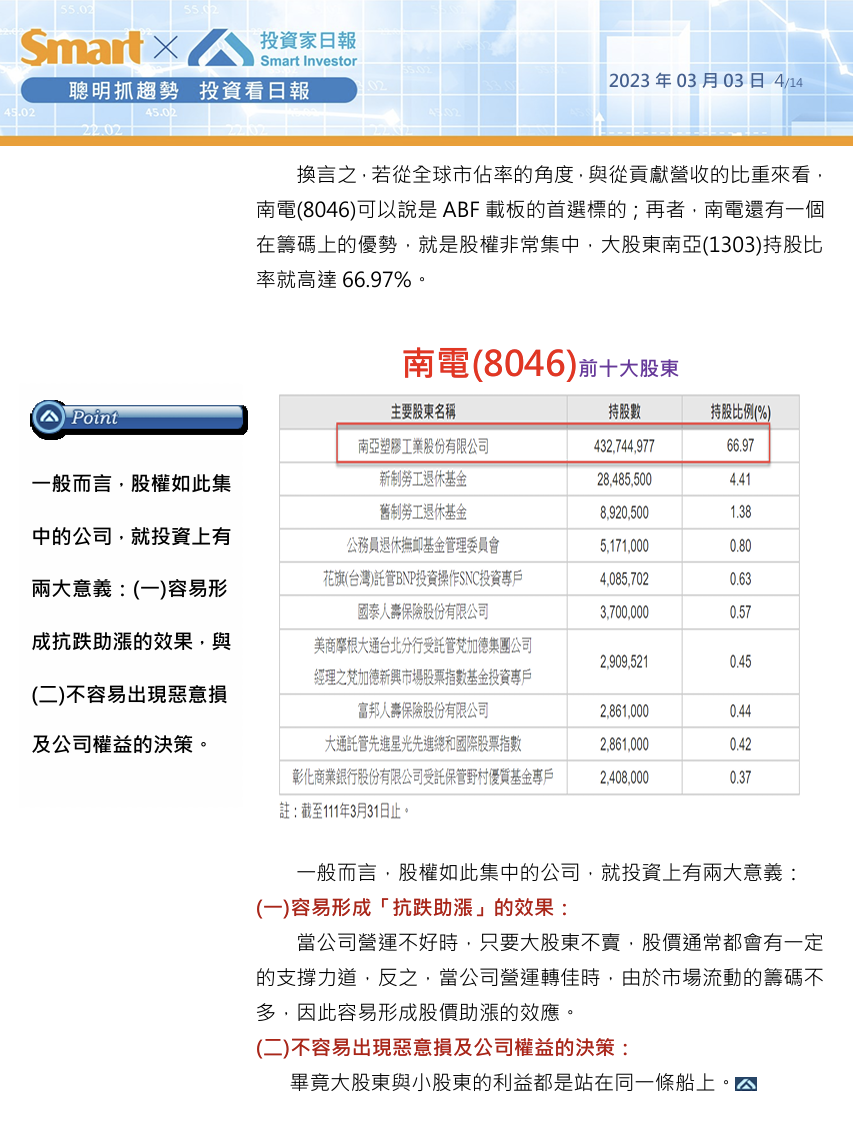 換言之,若從全球市佔率的角度,與從貢獻營收的比重來看,南電(8046)可以說是ABF載板的首選標的;再者,南電還有一個在籌碼上的優勢,就是股權非常集中,大股東南亞(1303)持股比率就高達66.97%。