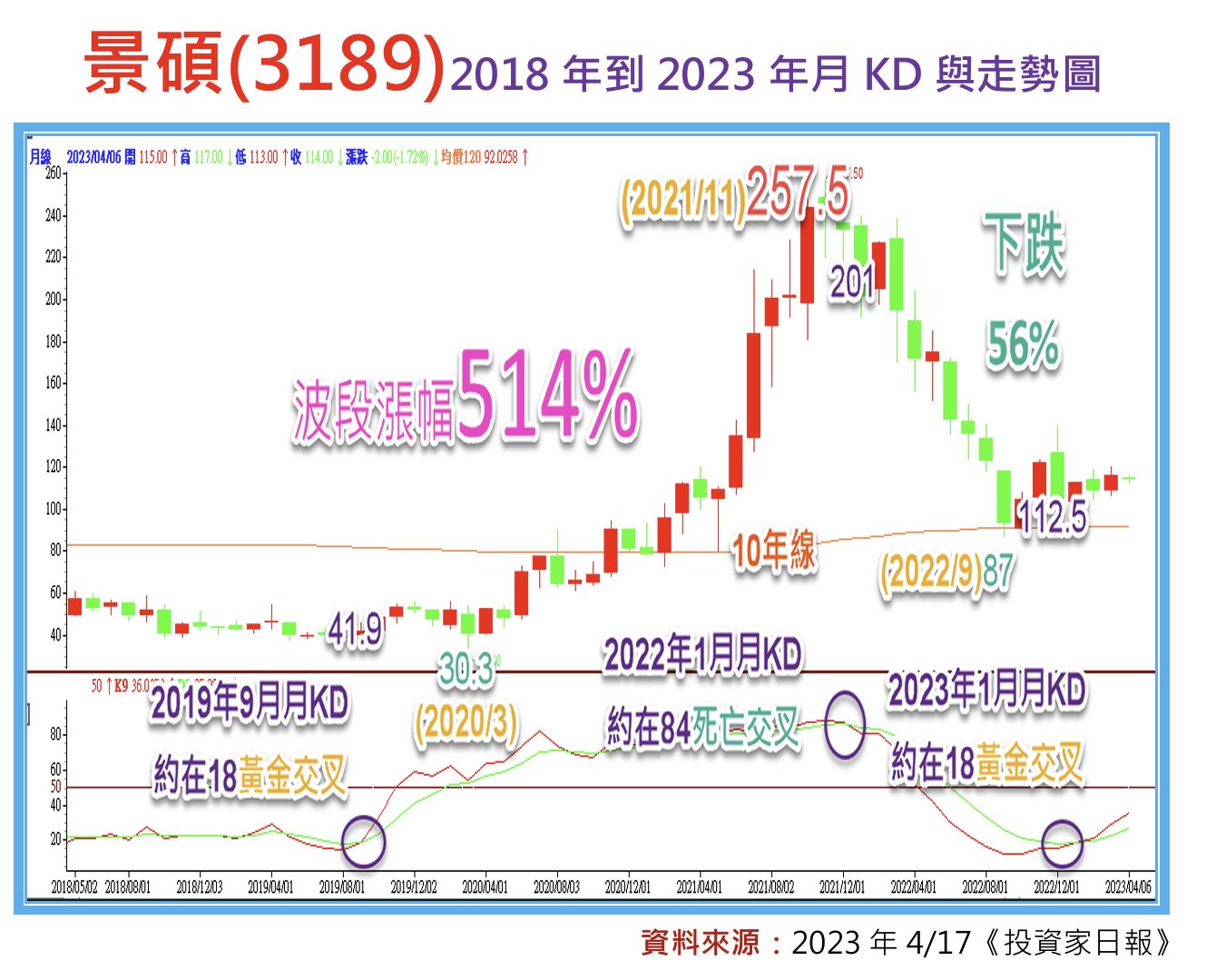 值得留意的是,回顧上一次景碩(3189)的月KD指標出現在20以下黃金交叉,時間可追溯到2019年的9月,當時月KD指標不僅在18附近完成黃金交叉,更開啟了後續股價從41.9元,飆漲到257.5元,波段漲幅高達514%的多頭行情。