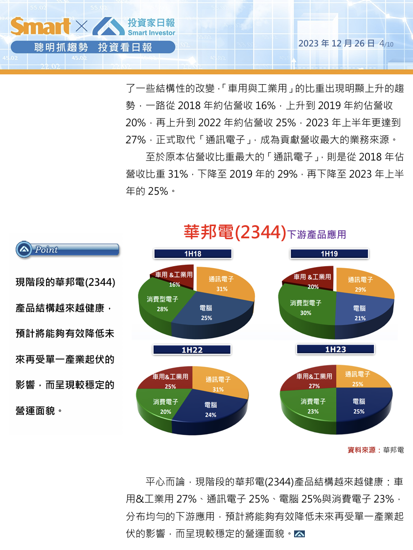 平心而論,現階段的華邦電(2344)產品結構越來越健康:車用&工業用27%、通訊電子25%、電腦25%與消費電子23%,分布均勻的下游應用,預計將能夠有效降低未來再受單一產業起伏的影響,而呈現較穩定的營運面貌。
