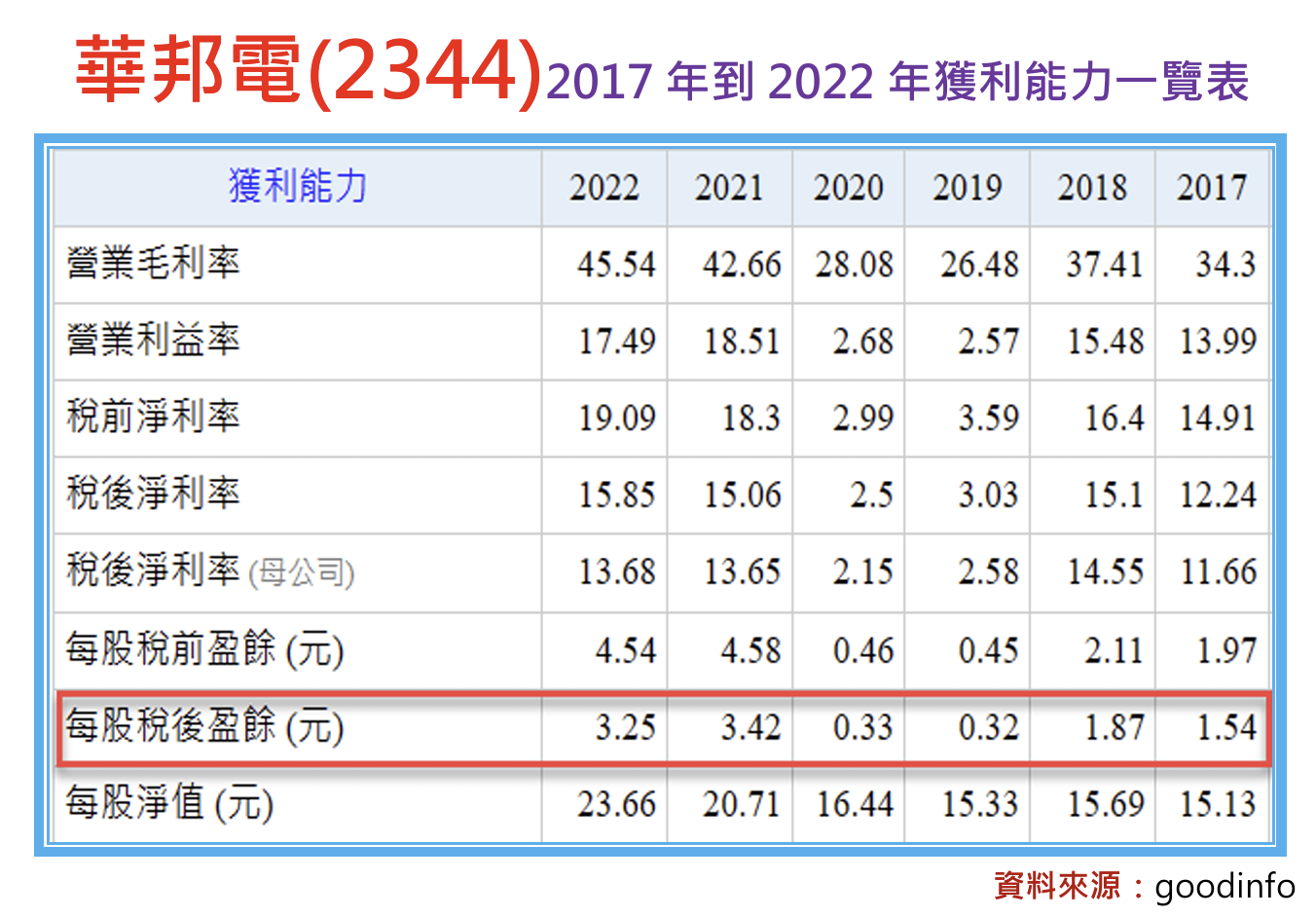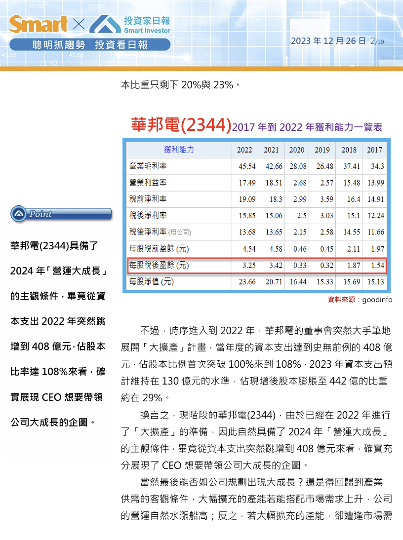 追蹤2017年以來華邦電(2344)的資本支出規劃,2017年到2019年有一段「擴充產能」的小高峰,分別投入152億元、167億元、132億元,佔398億股本的比重分別為38%、42%與33%,從目前的結果論來看,似乎奠定了後來獲利走升的基礎,2021年每股稅後盈餘EPS來到3.42元,2022年來到3.25元。