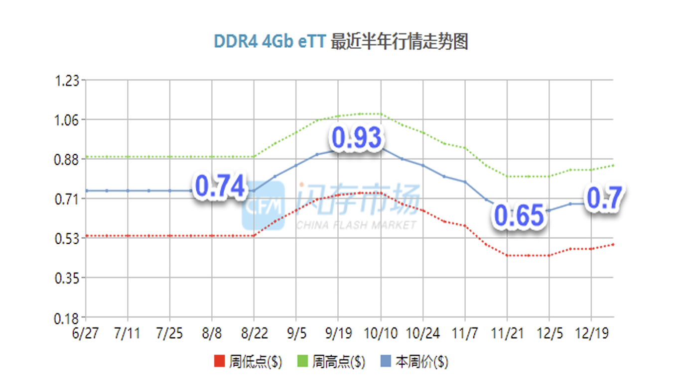 首先,先來討論貢獻營收約40%的DRAM,若以DDR4 4GB eTT近期的報價走勢,確實看到了價格從谷底翻揚的契機,從11/21的最低點0.65美金,回升到12/26的0.7美金,價格上漲了7.6%,雖然距離9/19的高點0.93美金,仍有一段差距,但至少目前產品價格不僅不再走跌,甚至還出現翻轉的契機,都是一件好事。