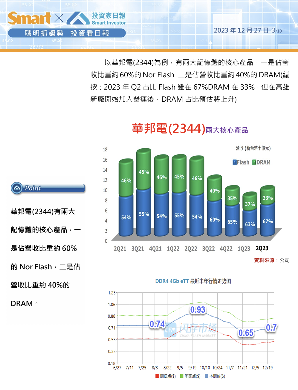 以華邦電(2344)為例,有兩大記憶體的核心產品,一是佔營收比重約60%的Nor Flash,二是佔營收比重約40%的DRAM(編按:2023年Q2占比Flash雖在67%DRAM在33%,但在高雄新廠開始加入營運後,DRAM占比預估將上升)