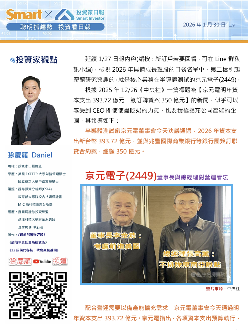延續1/27日報內容(編按:新訂戶若要回看,可在Line群私訊小編),檢視2026年具備成長飆股的口袋名單中,第二檔引起慶龍研究興趣的,就是核心業務在半導體測試的京元電子(2449)。