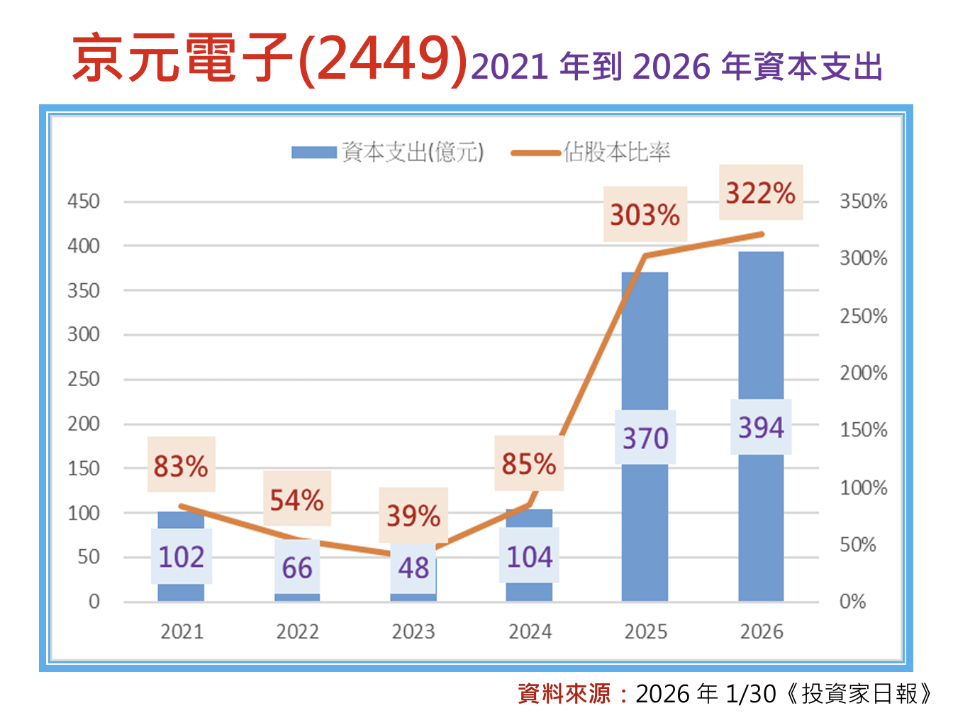 時序進入到2026年,原以為資本支出的金額會下降,就如同2021年達到102億元,佔股本比率來到83%之後,2022年就下降到66億元,佔股本比率下降到54%,2023年再持續下降到48億元,佔股本比率下降至39%,但顯然下游客戶的需求,比預期來得還要高,因此2026年非但沒有下降,反而還持續上揚到394億元,佔股本比率一舉拉升到322%。