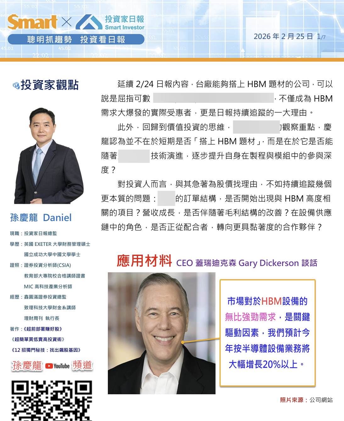 此外,回歸到價值投資的思維,****(****)的觀察重點,慶龍認為並不在於短期是否「搭上HBM題材」,而是在於它是否能隨著****的技術演進,逐步提升自身在製程與模組中的參與深度?