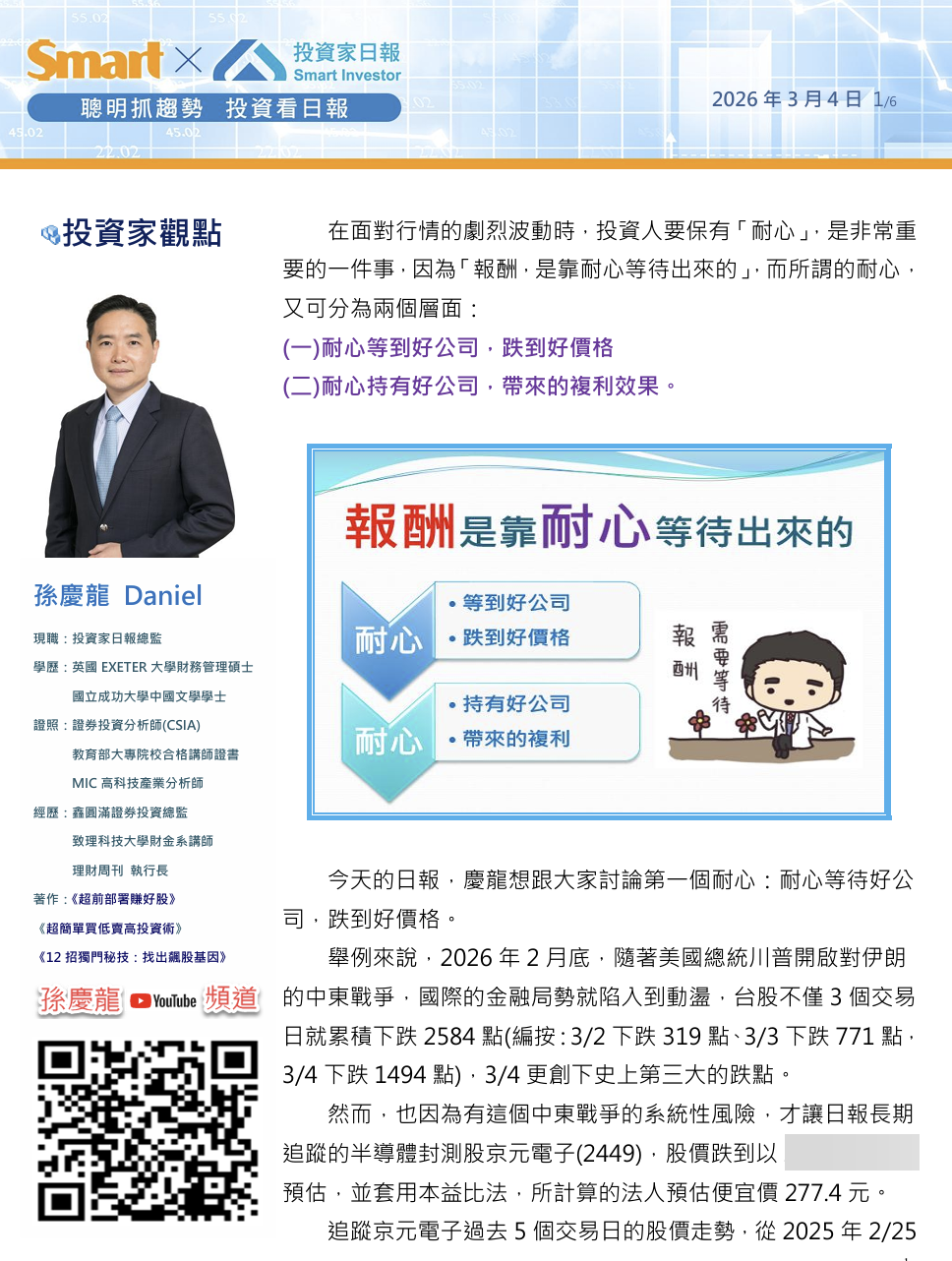 今天的日報,慶龍想跟大家討論第一個耐心:耐心等待好公司,跌到好價格。