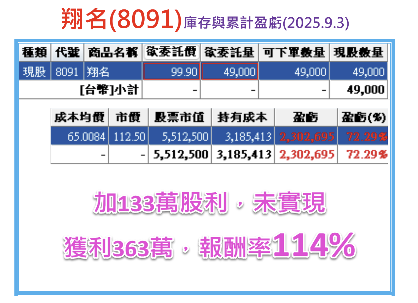當天翔名(8091)股價收在113.5元