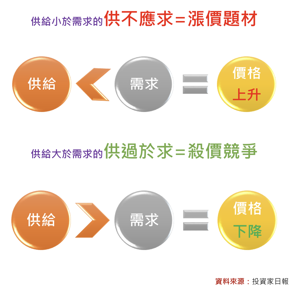 當「供給」小於「需求」時,就會造成供不應求的漲價題材,不僅會直接推升產品價格上升,更會帶動相關廠商營運的水漲船高。