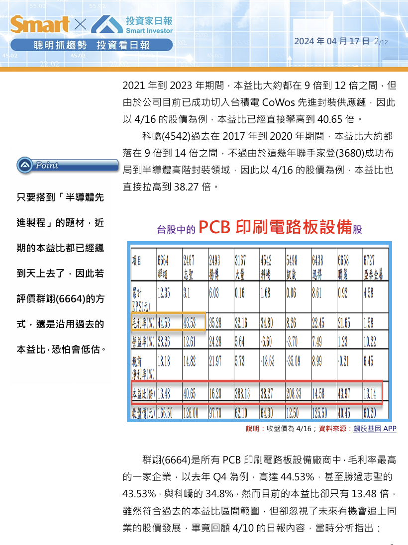 以台股中PCB印刷電路板設備股為例,志聖(2467)過去在2021年到2023年期間,本益比大約都在9倍到12倍之間,但由於公司目前已成功切入台積電CoWos先進封裝供應鏈,因此以4/16的股價為例,本益比已經直接攀高到40.65倍。