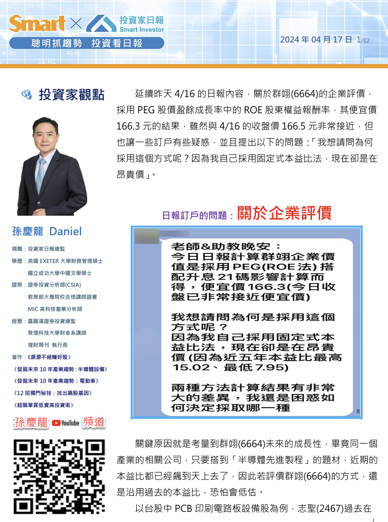 關於群翊(6664)的企業評價,採用PEG股價盈餘成長率中的ROE股東權益報酬率,其便宜價166.3元的結果,雖然與4/16的收盤價166.5元非常接近,但也讓一些訂戶有些疑惑,並且提出以下的問題:「我想請問為何採用這個方式呢?因為我自己採用固定式本益比法,現在卻是在昂貴價」。