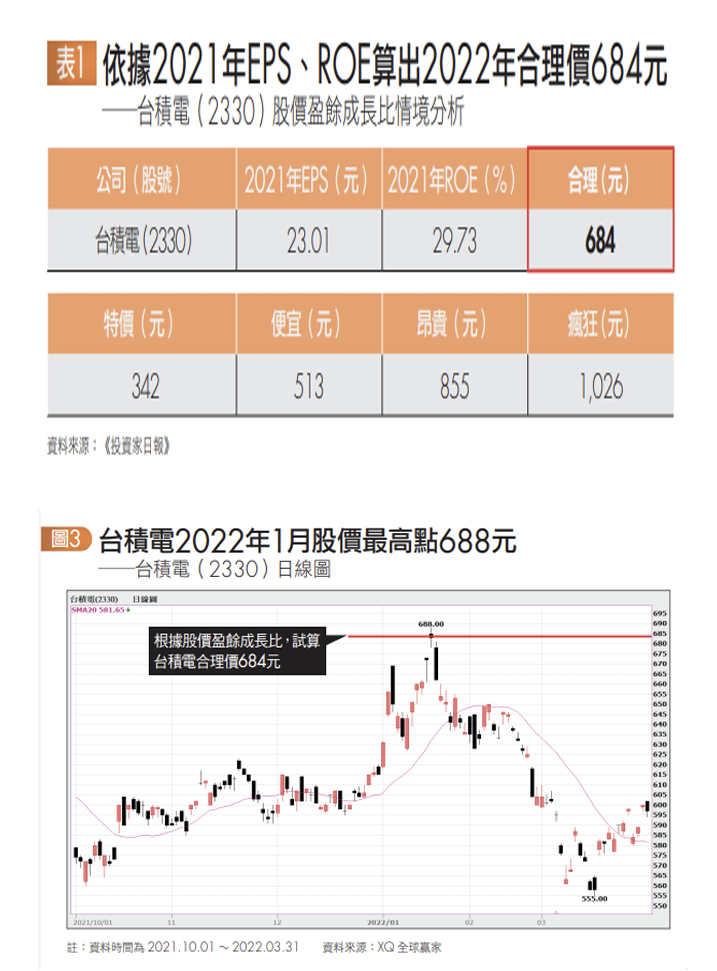 範例:假設2022年時要為台積電(2330)估價,採取上述方法 4,以2021年股東權益報酬率29.73% 作為預估盈餘成長率,並參考2021年的每股盈餘23.01 元,再搭配我所主張便宜價到瘋狂價的股價盈餘成長比區間,即可將台積電的合理股價試算如下(詳見表1):